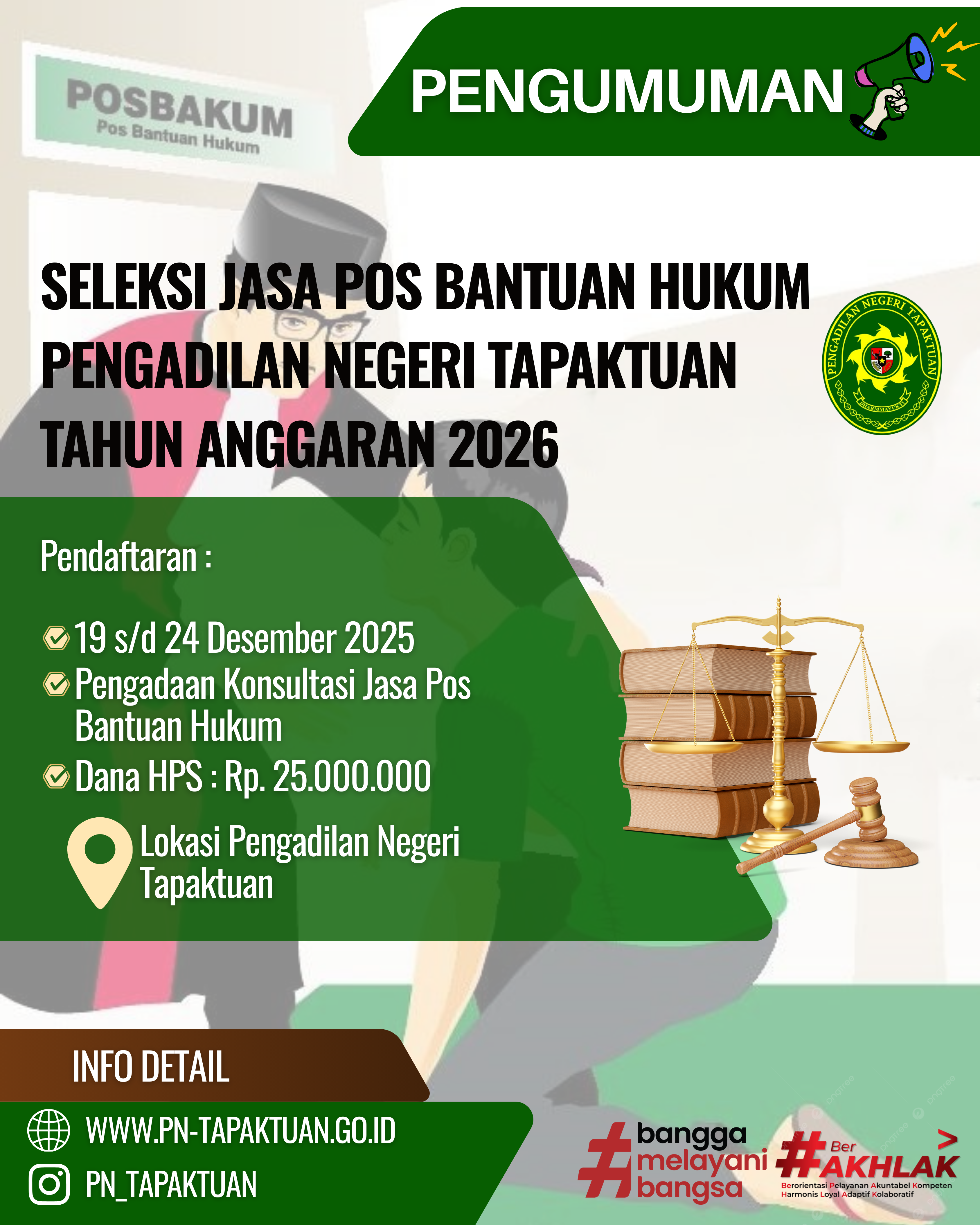 Tapaktuan, 19/12/2025. Pembentukan Panitia Seleksi Lembaga Pemberi Layanan Pos Bantuan Hukum (Posbakum) Pengadilan Negeri Tapaktuan Tahun Anggaran 2026. Informasi lebih lanjut download dokument dibawah.
